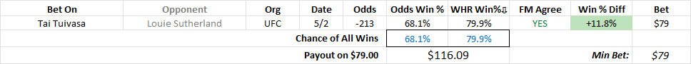- After 4 fighters (top 4 by WHR Win %), I will only add additional if there is reasonable value (WHR% – Odds%) >20%?
